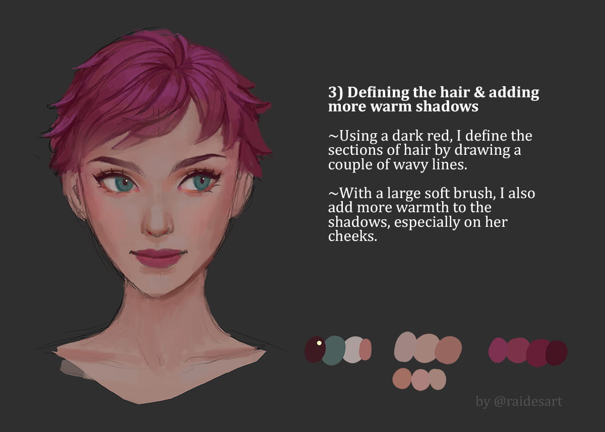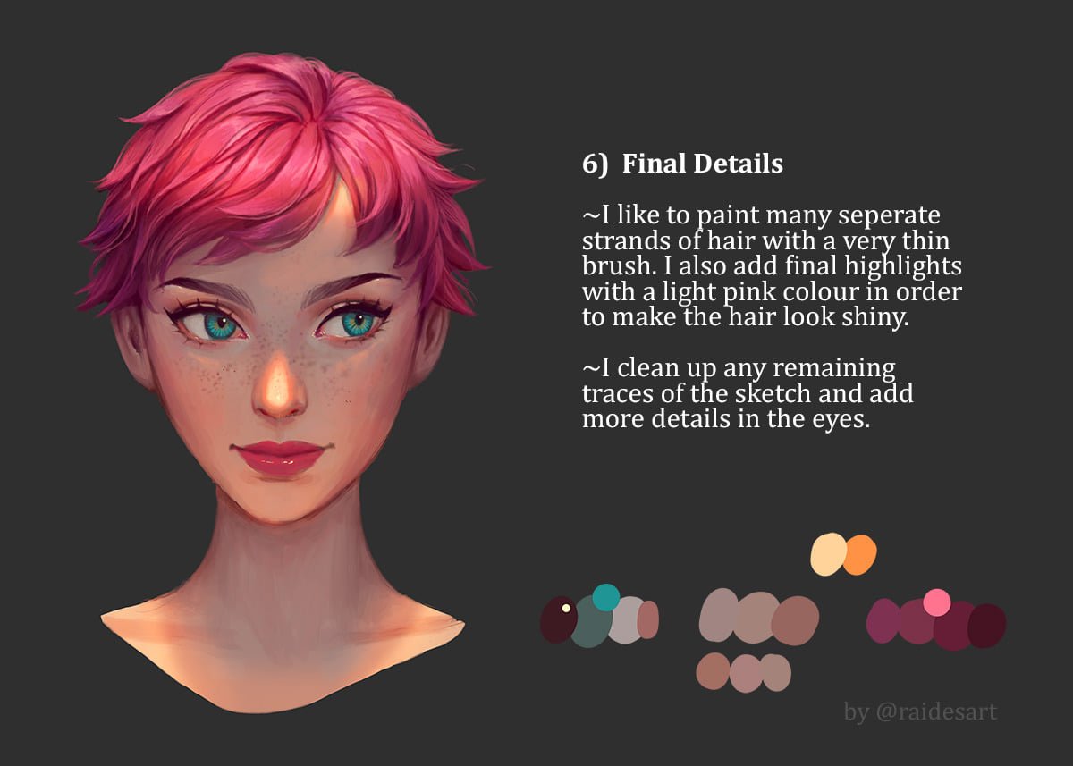 – Tỉa các sợi tóc bằng cọ mảnh và thêm màu sáng để tóc nhìn bóng bẩy (ở đây là màu hồng sáng).